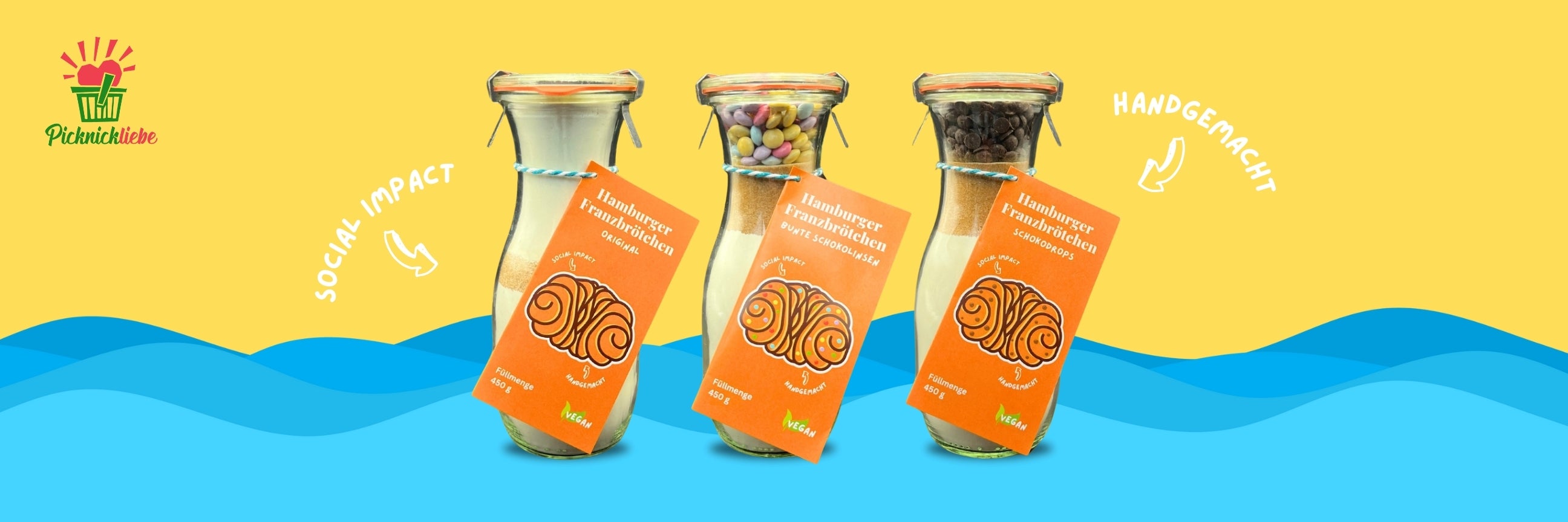 Friede, Freude, Franzbrötchen – Picknickliebe stellt in Zusammenarbeit mit gemeinnützigen Organisationen vegane Franzbrötchen-Backmischungen im Glas her. Jede Backmischung besteht aus hochwertigen Bio-Zutaten, die von regionalen Unternehmen bezogen werden. Zudem spendet jede verkaufte Franzbrötchen-Backmischung an einen guten Zweck. Die Franzbrötchen-Backmischungen können in vier einfachen Schritten zubereitet werden und beinhalten eine passende Backanleitung auf jedem Etikett.