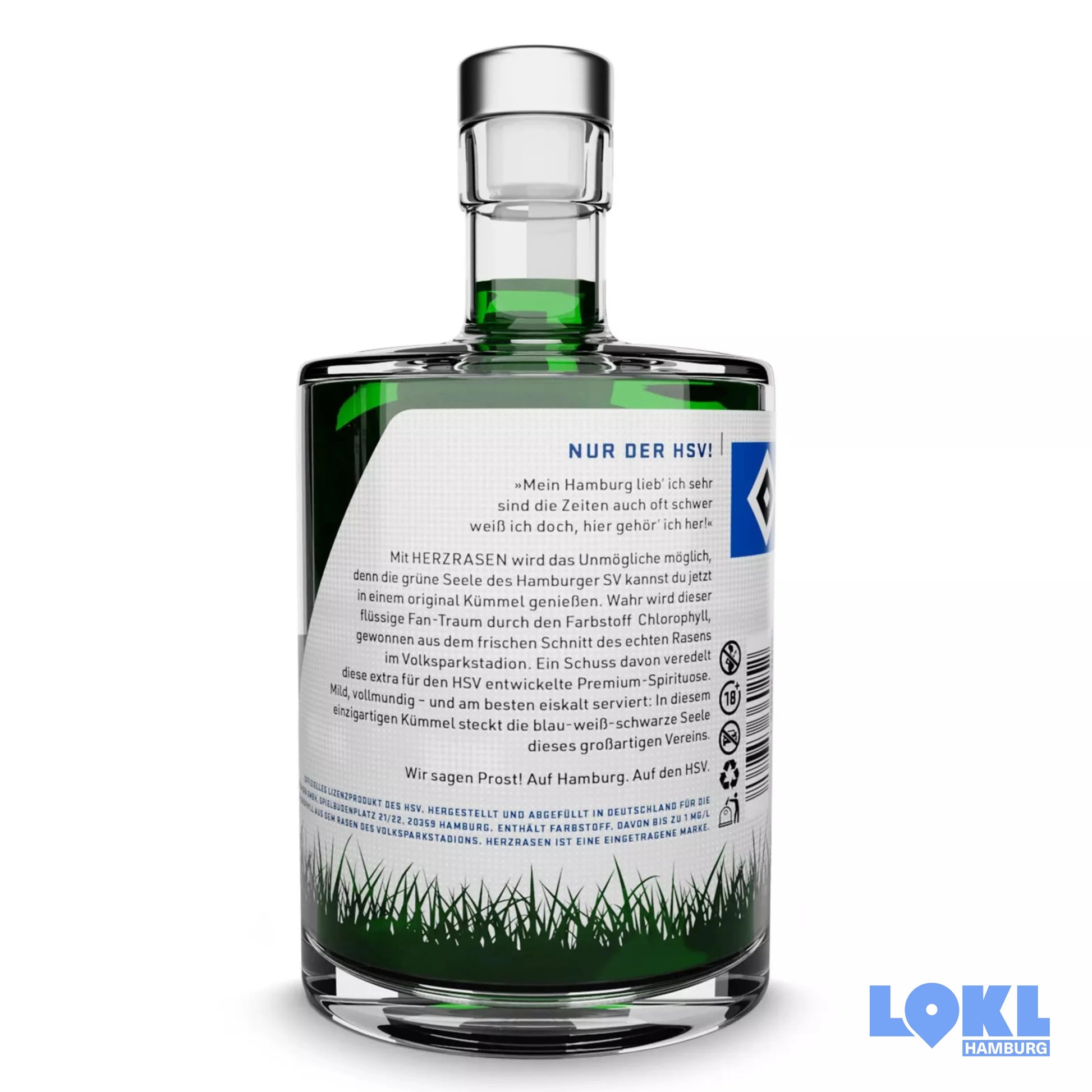 Mit HERZRASEN wird das Unmögliche möglich, denn die grüne Seele des Hamburger SV kannst du jetzt in einem original Kümmel genießen. Wahr wird dieser flüssige Fan-Traum durch den Farbstoff Chlorophyll, gewonnen aus dem frischen Schnitt des echten Rasens im Volksparkstadion. Ein Schuss davon veredelt diese extra für den HSV entwickelte Premium-Spirituose.