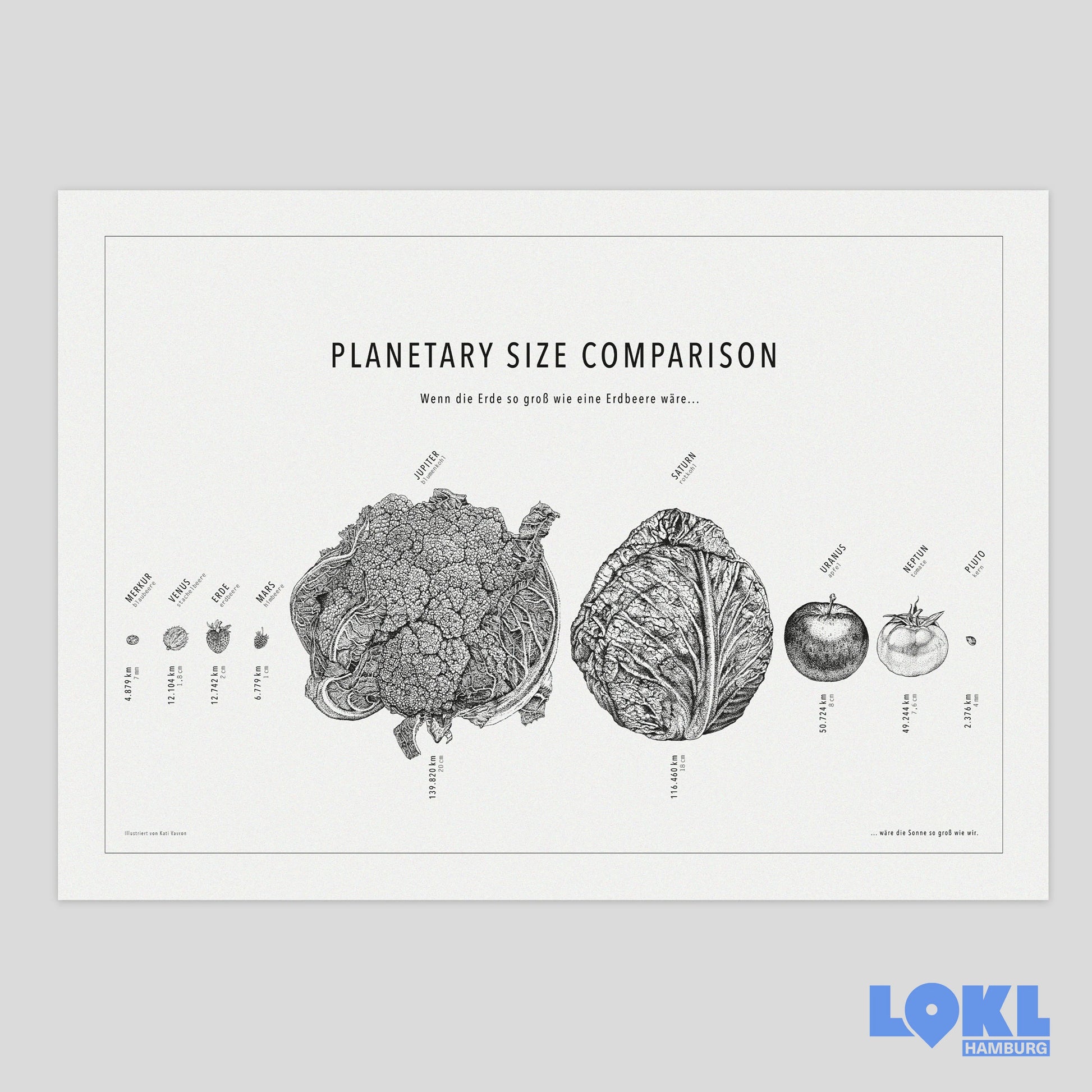 Anhand von Obst und Gemüse werden die unterschiedlichen Größen unserer Planeten bildhaft veranschaulicht. Unglaublich, wie groß z.B. Jupiter und Saturn im Vergleich zur Erde sind!