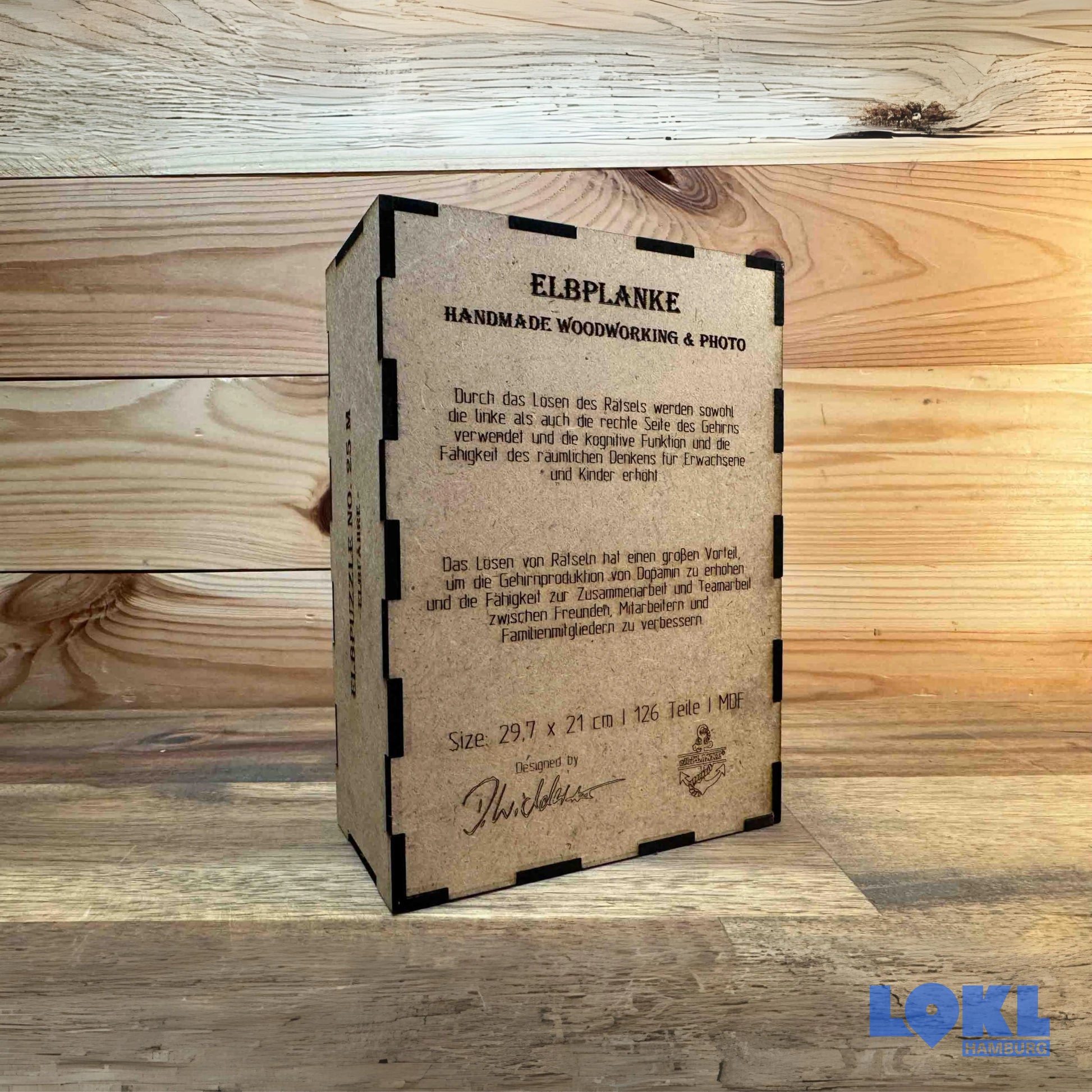 Die Puzzleteile werden in einer praktischen Holzbox geliefert, die nicht nur die Aufbewahrung erleichtert, sondern dem Puzzleabenteuer auch einen eleganten Touch verleiht. Die Holzbox kann auch als dekoratives Element in deinem Zuhause verwendet werden.