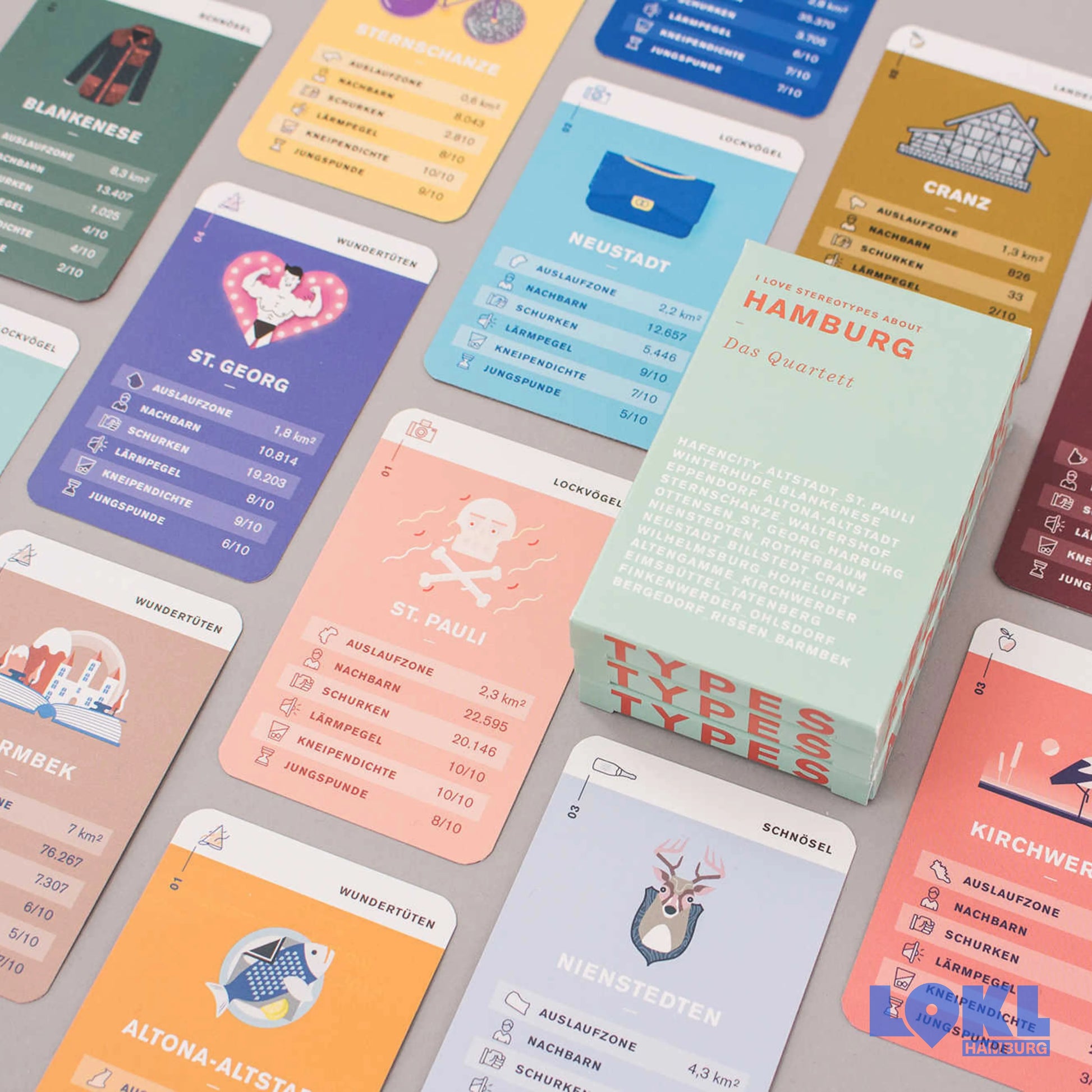 Spiel, Satz und Kiez – das Hamburg Stadtteil-Quartett. Gehört euer Stadtteil zu den Schnöseln, Lockvögeln oder Landeiern oder seid ihr stilbewusste Trendsetter? Unter 32 Stadtteilen können nicht nur waschechte Hamburger, sondern auch Neu-Hamburger mehr zur Kneipendichte oder Lärmpegel ihres Kiezes erfahren. Mit aktuellen Stadtteil-Statistiken des Jahres 2020.