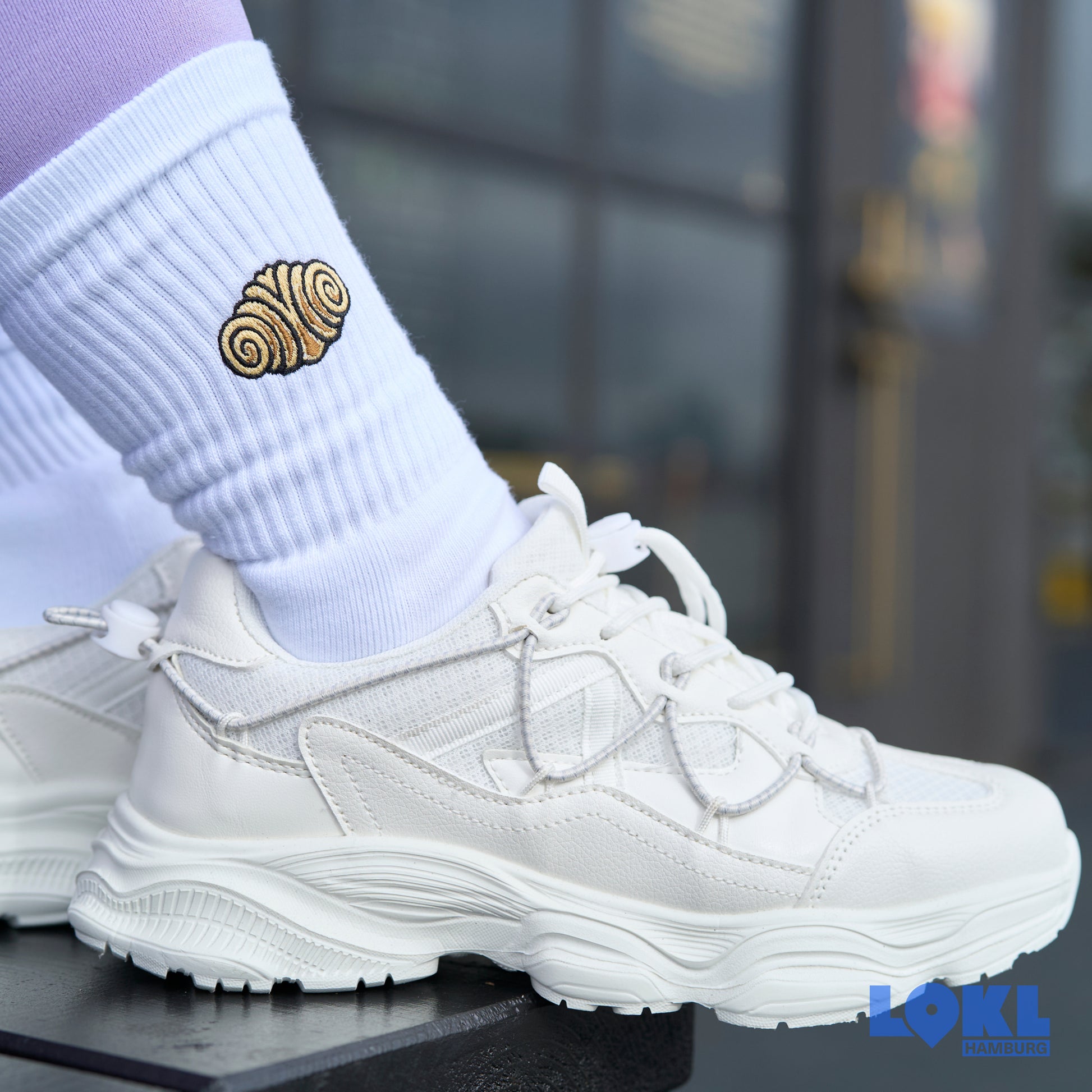 Heute ist das Franzbrötchen nicht nur Kultgebäck, sondern echtes Heimatgefühl. Genau dieses Gefühl bringen die Quittje Franzbrötchen-Socken an deine Füße: norddeutsch, gemütlich, ein bisschen frech – und immer ein Stück Hamburg dabei.