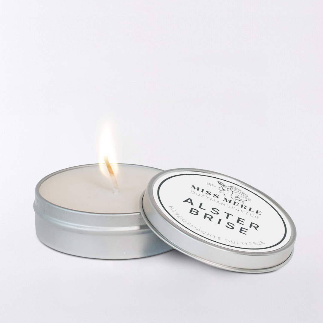 Die handgefertigte Travel Candle Alster Brise ist klein, handlich und aus Sojawachs - perfekt für unterwegs. Die unzerbrechliche Aluminiumdose ist nicht nur praktisch - sie ist auch zu 100% recyclebar!